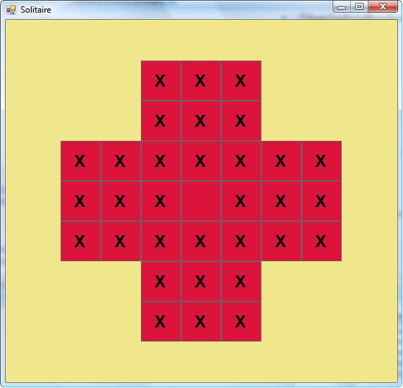 Bij het starten van de applicatie wordt een formulier getoond met het solitaire spelbord. Dit spelbord bevat 32 pionnen en één lege plaats die zich exact in het midden van het bord bevindt. Een pion kan naar het lege vakje springen wanneer er zich tussen hem en de lege plaats één pion bevindt. Na de sprong wordt de pion die zich tussenin bevond van het bord verwijderd waardoor er een extra lege plaats komt. Het uiteindelijke doel bestaat erin om via verticale en horizontale sprongen alle pionnen, op éé pion na, van het bord weg te spelen.