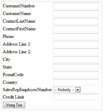 Zorg er voor dat alle verplichte velden (zie tabel customers in datank) moeten ingevuld worden. Je hoeft nog niet te controleren op geldigheid van de waarden.