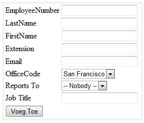 Zorg er voor dat alle verplichte velden (zie tabel employees in datank) moeten ingevuld worden. Je hoeft nog niet te controleren op geldigheid van de waarden.