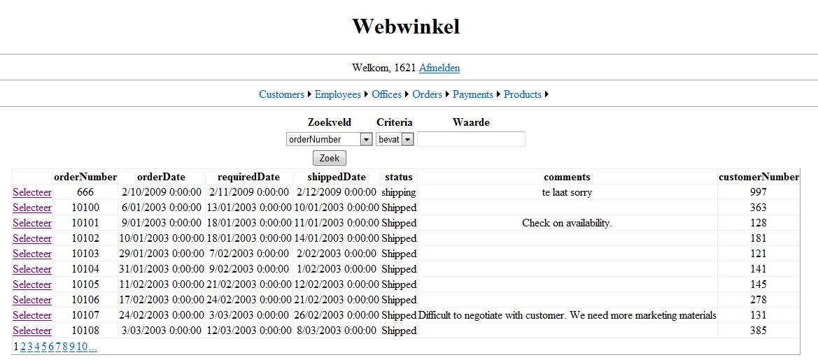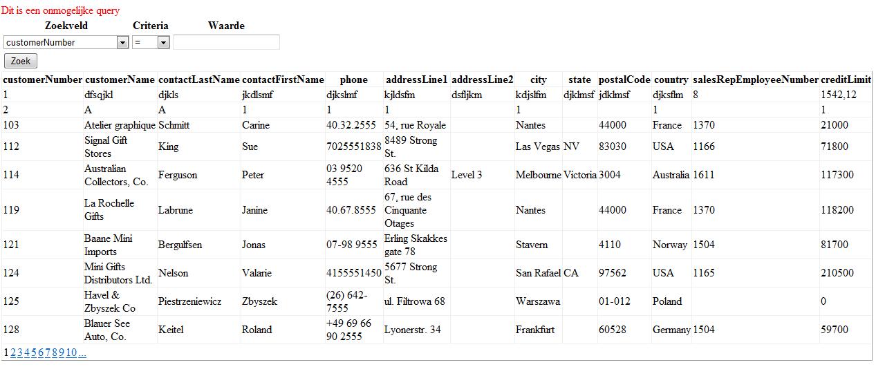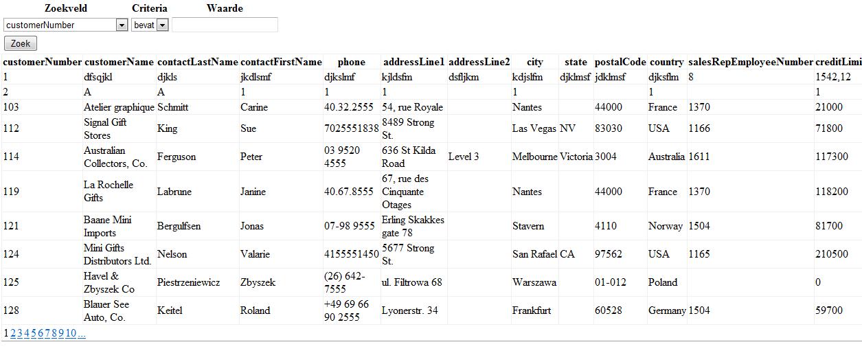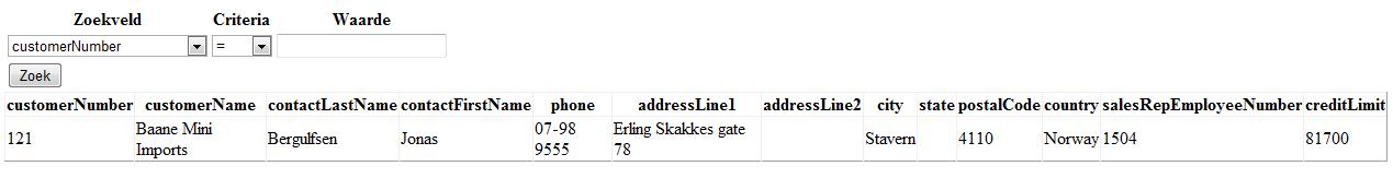Als een gebruiker zoek naar bijvoorbeeld "customerNumber = 121" dan verschijnen onderaan alle items die voldoen aan deze query.