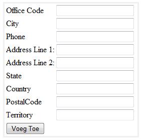 Zorg er voor dat alle verplichte velden (zie tabel offices in datank) moeten ingevuld worden. Je hoeft nog niet te controleren op geldigheid van de waarden.
