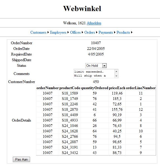 Wanneer je op de link selecteer klikt kom je op de pagina order.aspx terecht waar je de gegevens van een order te zien krijgt en indien nodig kan het order beperkt aangepast worden.