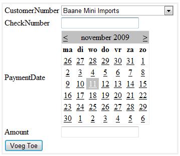 Maak de pagina payments.aspx waarmee een gebruiker een nieuw payment kan toevoegen aan de databank.De vorm van de pagina kan je hier vinden.