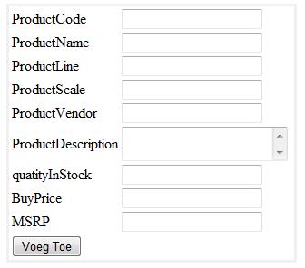Zorg er voor dat alle verplichte velden (zie tabel products in datank) moeten ingevuld worden. Je hoeft nog niet te controleren op geldigheid van de waarden.