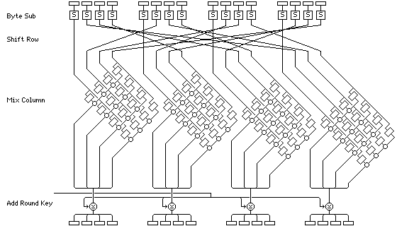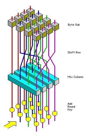 Although this page (and the preceding one) already have several diagrams of Rijndael, I've included yet another one, one even more simplified than the one appearing on the previous page, to make it easier to "see the forest for the trees", and see both that the Mix Column step indeed only mixes columns, and is the only place where that happens, and how the Shift Row step works with the Mix Column step to ensure that all parts of the block impinge on each other.