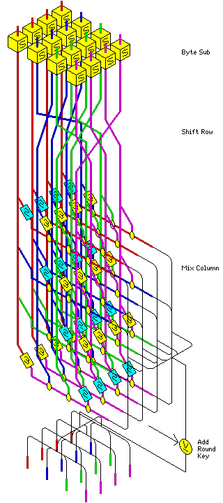 Although a three-dimensional color diagram of the round has already appeared at the beginning of the page, the Rijndael round can also be illustrated in a more conventional manner: