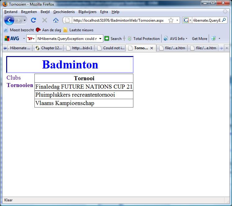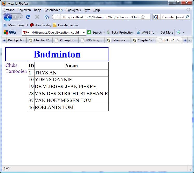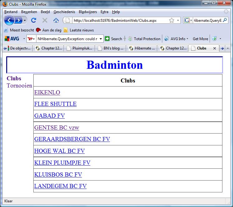 Maak een webapplicatie in ASP.NET waarin je de gemaakte datalaag gebruikt: de applicatie bevat een overzicht van alle clubs en een overzicht van alle tornooien. Als je op een club klikt dan krijg je zijn leden te zien.